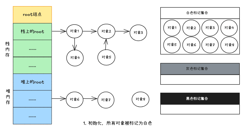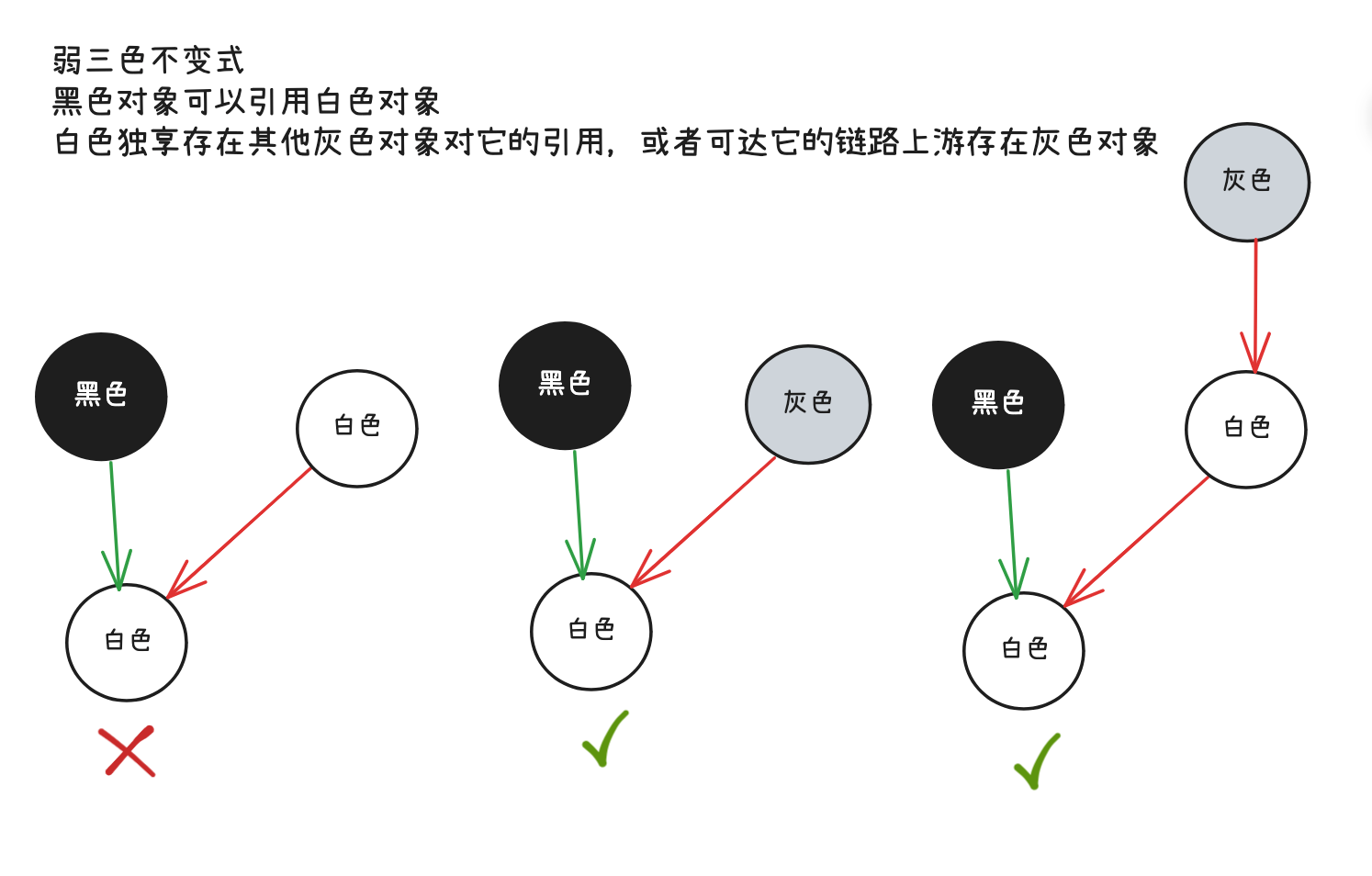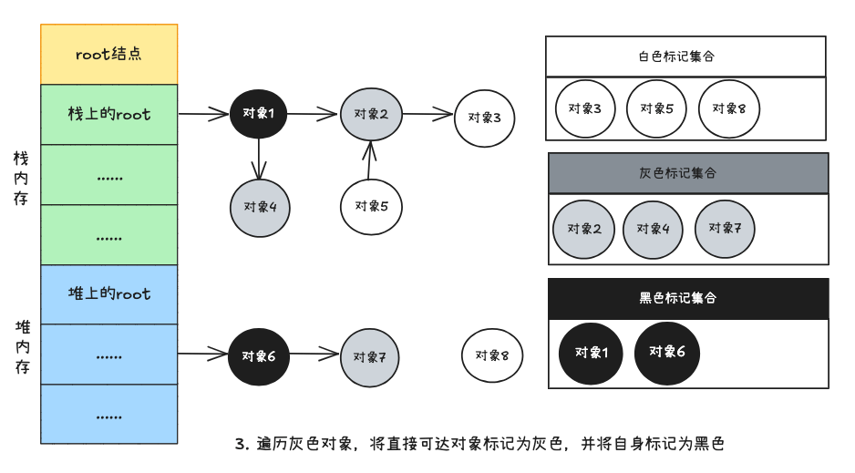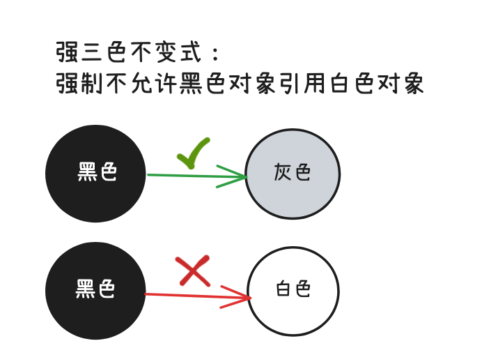 - 📜 规则:黑色对象可以引用白色对象,但白色对象必须存在灰色对象的间接引用