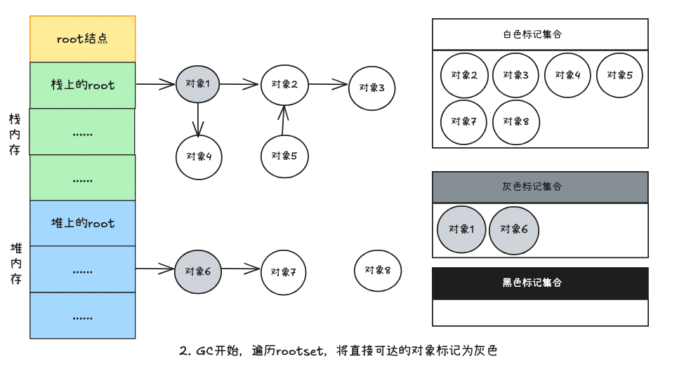 - 🚀 GC 开始,遍历 rootset,将直接可达的对象标记为灰色